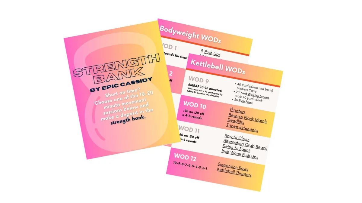 A go-to list of workouts of 20 minute workouts that you can do when you are short on time, but want to make a deposit in the strength bank. Youtube videos linked with demos by Cassidy